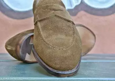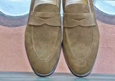in Snuff Suede on Leather Sole. Last 341, Fitting E, UK Sizes 7 – 11, € 420,-