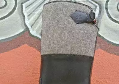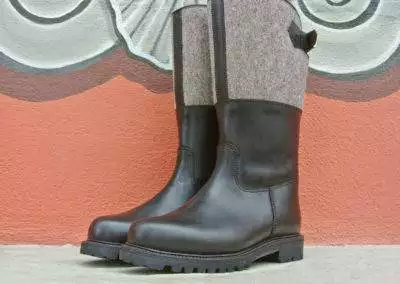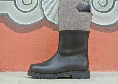 Robustes Juchtenleder dunkelbraun, Schaftoberteil aus Filz hellgrau, Lammfellfutter, Schließe am Schaft, reißfeste Anzugschlaufen aus Köperband (innen), Geländesohle, 360° rahmengenäht.