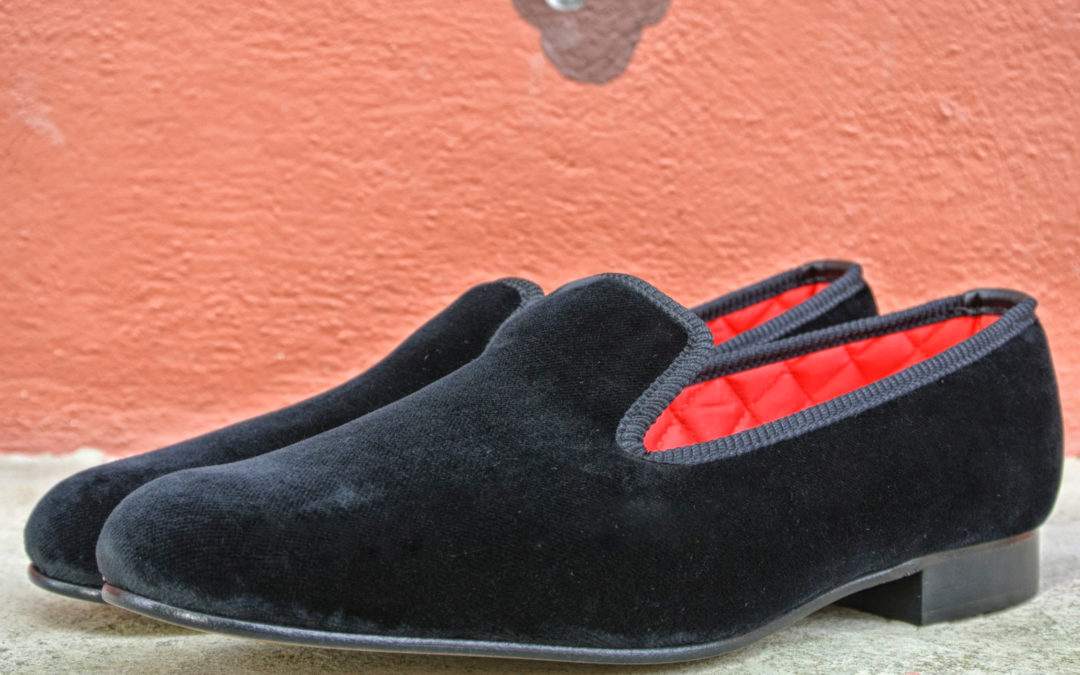 Schuh des Monats Dezember 2016 Black Velvet / Red Quilt Lining / Hard Leather Sole / UK Men’s Sizes / Handmade in England
